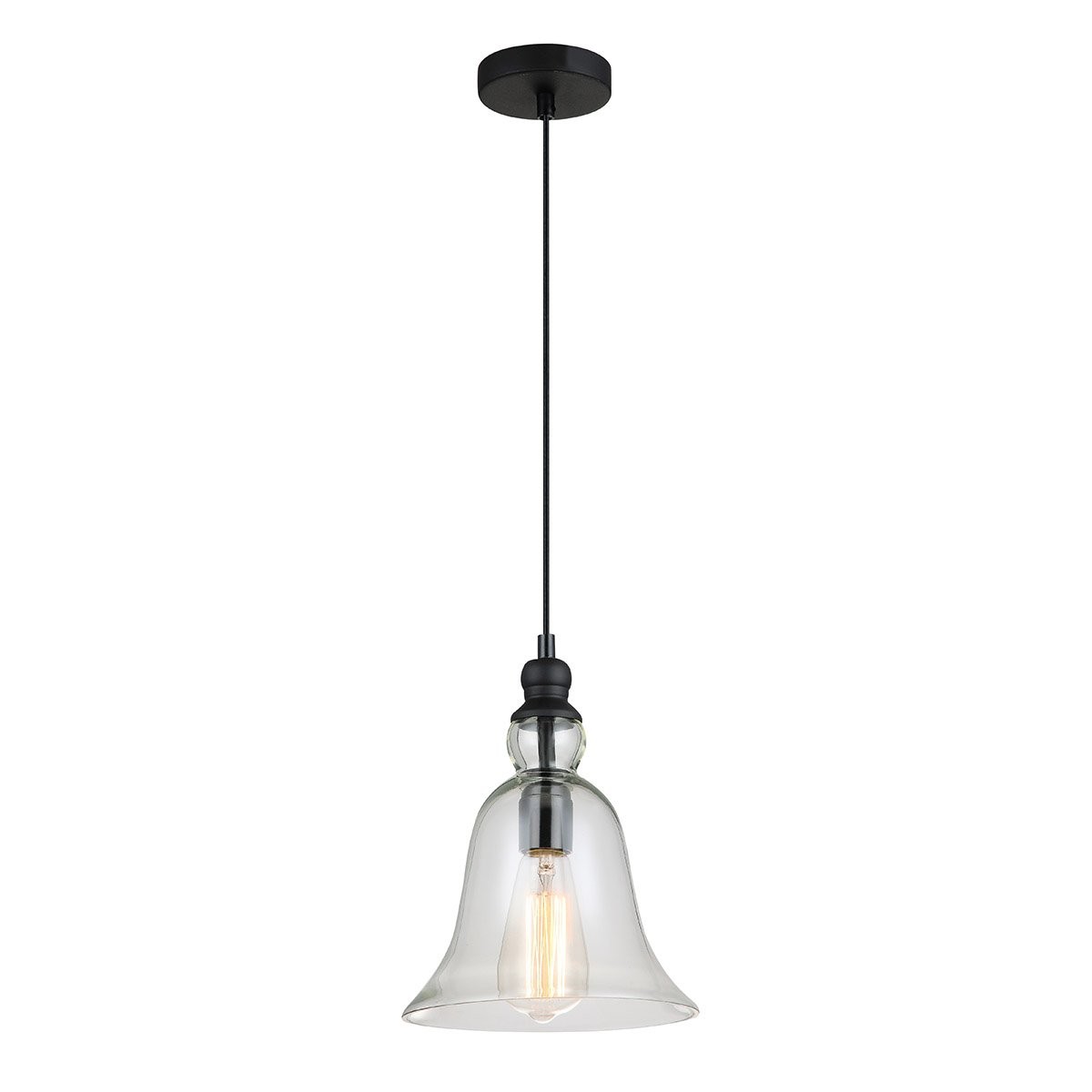 Sklenená lampa v tvare zvončeka je zavesená vo výške 1000 mm. Jej priemer je 210 mm a výška 280 mm. Kovové detaily sú v matne čiernej farbe, číre sklo potom dáva priestor vyniknúť svetelnému zdroju. Pre zachovanie retro štýlu odporúčame vyberať z ponuky dizajnových žiaroviek s päticou E27 , vďaka ktorým sa svetlo stane štýlovým doplnkom vašej domácnosti.