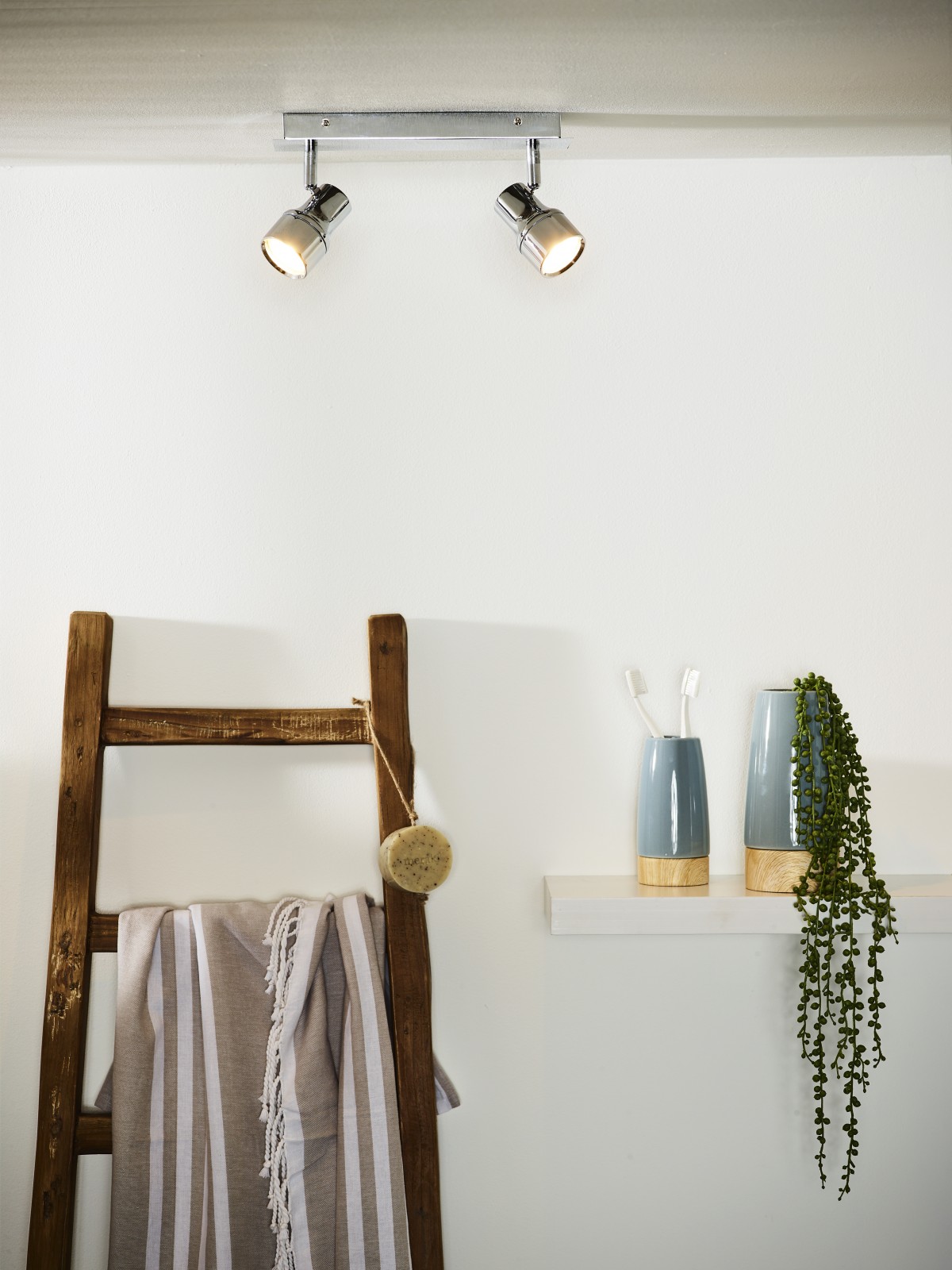 Moderná kúpeľňa v lesklom chróme alebo v bielom laku. Jednoduché otočné a sklápacie kovové svietidlo, triezvy dizajn bez ozdôb, ale za to výkonné a stmievateľné svetlo.