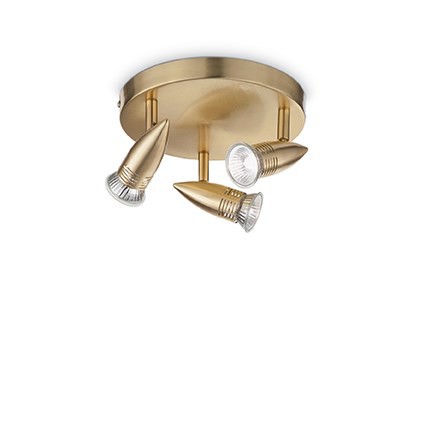Kovové teleso v saténovo mosadznej úprave. Toto bodové svetlo je polohovateľné, s rotáciou tienidla a v kĺbe pre sklon.