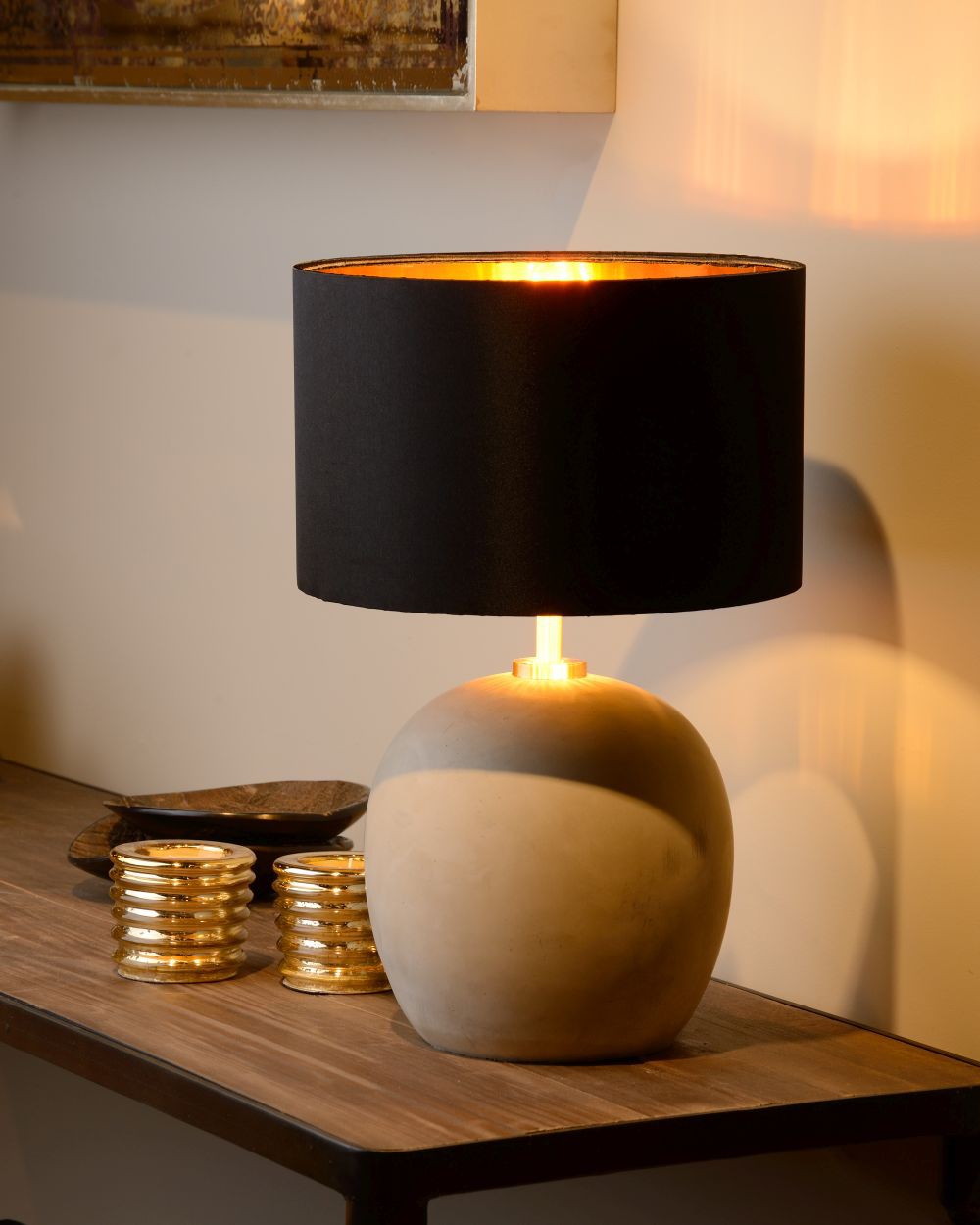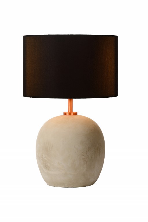 Zostava z betónu, kovu a bavlny. Matný zlatý krk spája betónovú základňu a lesklé bavlnené tienidlo, ktoré pri svietení žiari v červenej medi. Klasická elegancia vo Vašom interiéri. Vypínač na kábli.