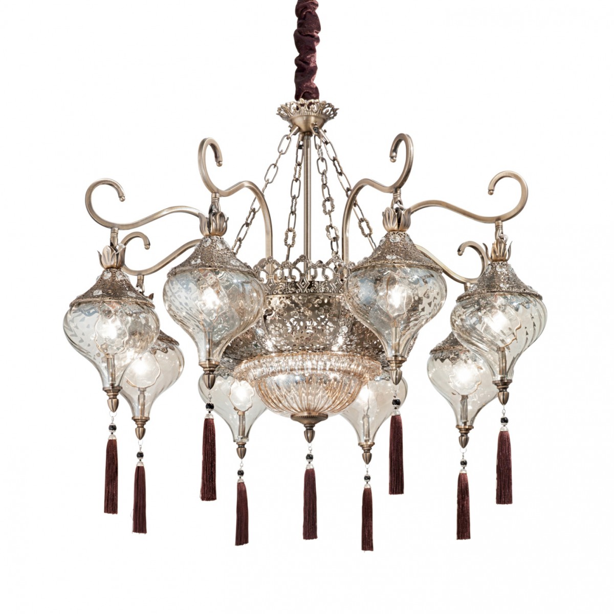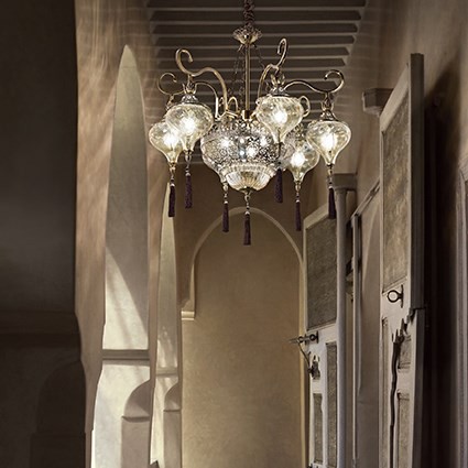 Nádherná remeselná práca, ktorá vás prenesie do Orientu. Starožitné mosadzné kovové telo s reliéfnymi ornamentami, v spodnej časti s krištáľmi. Tienidlá z fúkaného číreho skla s ľahkým jantárovým…